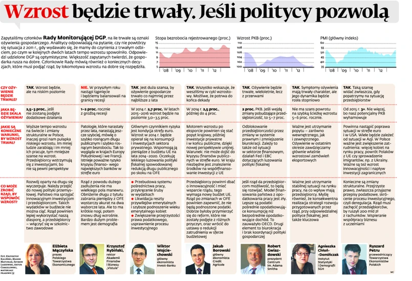 Analitycy odpowiadają na pytanie czy nie powtórzy się sytuacja z 2011 r., gdy wydawało się, że mamy do czynienia z trwałym odbiciem, po czym w kolejnych dwóch latach tempo wzrostu spowolniło. Odpowiedzi udzielone DGP są optymistyczne. Większość zapytanych twierdzi, że gospodarka rusza na dobre. Członkowie Rady mówią również o koniecznych decyzjach, które musi podjąć rząd by lokomotywa wzrostu na dobre rozpędziła się.