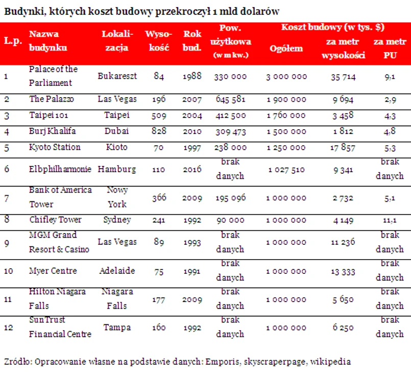 Zestawienie przygotowane przez Emporis sugeruje, że na świecie wniesiono dopiero 12 budynków, których koszt budowy wynosił przynajmniej 1 mld dolarów. Oczywiście lista ta może być niepełna, bo deweloperzy tego typu budynków nie zawsze stawiają na transparentność. Niemniej jednak 12 najdroższych kosztowało łącznie 16,4 mld dolarów, czyli równowartość 50,9 mld złotych. Obrazowo można tę kwotę przyrównać do znowelizowanego deficytu budżetowego Polski na ten rok (51,6 mld zł).