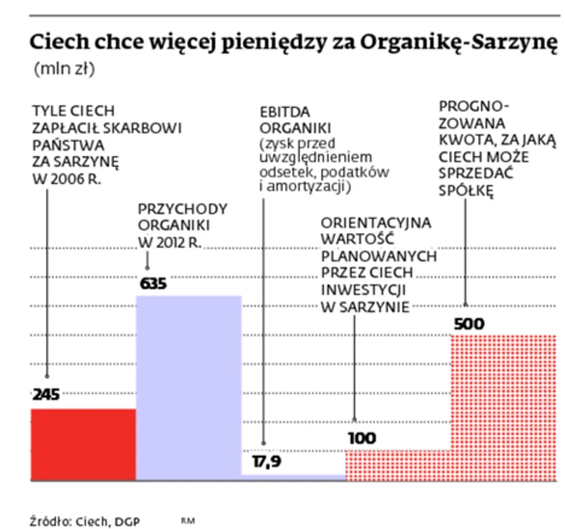 Ciech, wbrew dotychczasowym zapowiedziom i oczekiwaniom rynku, nie sprzeda w tym roku Organiki-Sarzyny – dowiedział się DGP. Koncern nie doszedł do porozumienia z Zakładami Azotowymi Puławy z Grupy Azoty, które były najbardziej zdeterminowane, by kupić firmę z Nowej Sarzyny na Podkarpaciu. Rozmowy na temat transakcji zawieszono. Od kilku miesięcy strony nie były w stanie porozumieć się w sprawie ceny.