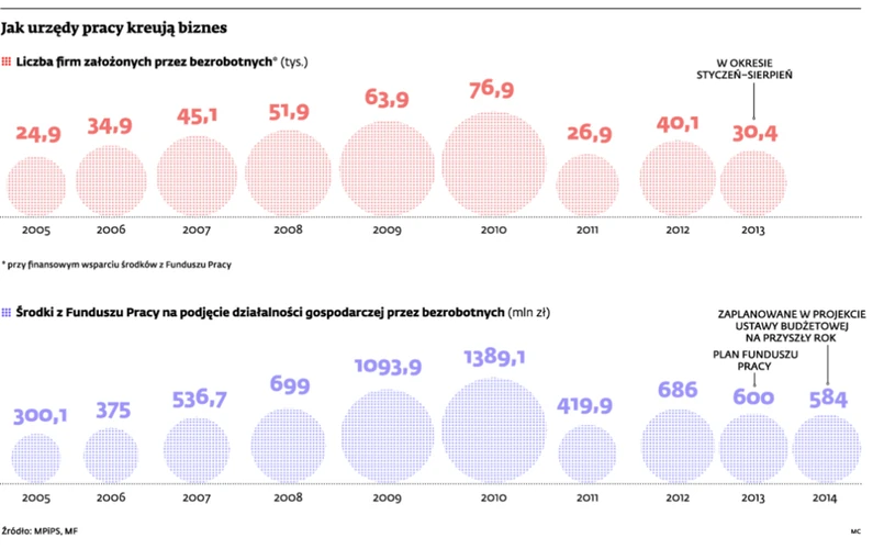 Obecne dotacje udzielane przez pośredniaki bezrobotnym pochodzą z Funduszu Pracy. Tworzy się go głównie z obowiązkowych składek odprowadzanych przez pracodawców za osoby podlegające ubezpieczeniu emerytalnemu i rentowemu oraz m.in. ze środków Unii Europejskiej. Według szacunków prof. Mieczysława Kabaja z Instytutu Pracy i Spraw Socjalnych fundusz ma obecnie nadwyżkę w wysokości 7–8 mld zł. – Środki te są jednak zamrożone przez resort finansów, który tłumaczy swoją decyzję trudną sytuacja finansów publicznych – podkreśla prof. Kabaj. Dodaje, że według badań około 10 proc. Polaków jest zdolnych do tworzenia własnego biznesu. Wobec tego spośród około 2 mln bezrobotnych aż 200 tys. mogłoby rozpocząć pracę na własny rachunek.