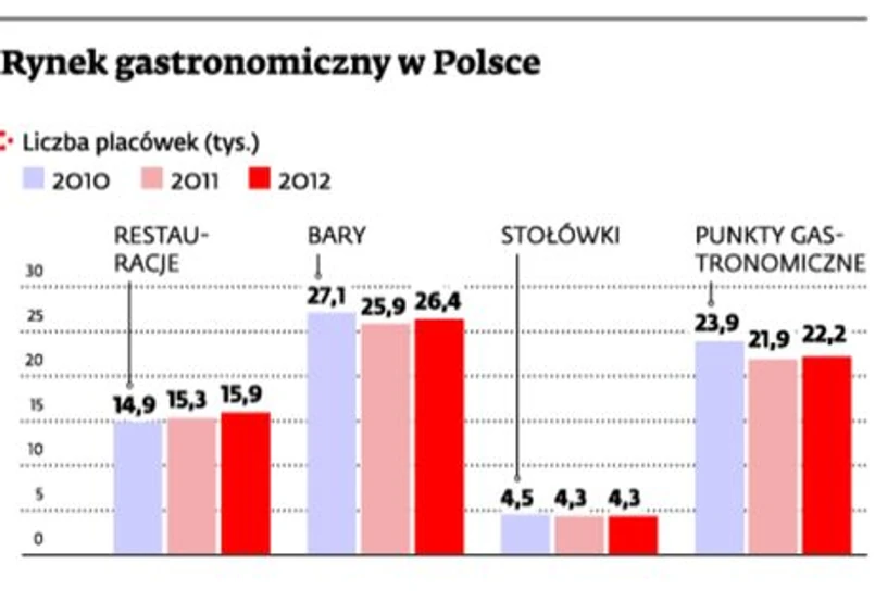 W 2012 r. przybyło w Polsce 1,4 tys. lokali gastronomicznych. Na koniec ubiegłego roku było ich 68,7 tys. – wynika z danych Głównego Urzędu Statystycznego. Ten wzrost jest zasługą przede wszystkim rozwoju barów i restauracji, których liczba zwiększyła się o ponad 1,1 tys. Tym samym konkurencja jeszcze bardziej się zaostrzyła, bo w sumie jest już 26,4 tys. barów i 15,9 tys. restauracji. Tak duży wybór sprawia, że coraz trudniej jest zaistnieć na rynku z nowym przedsięwzięciem.