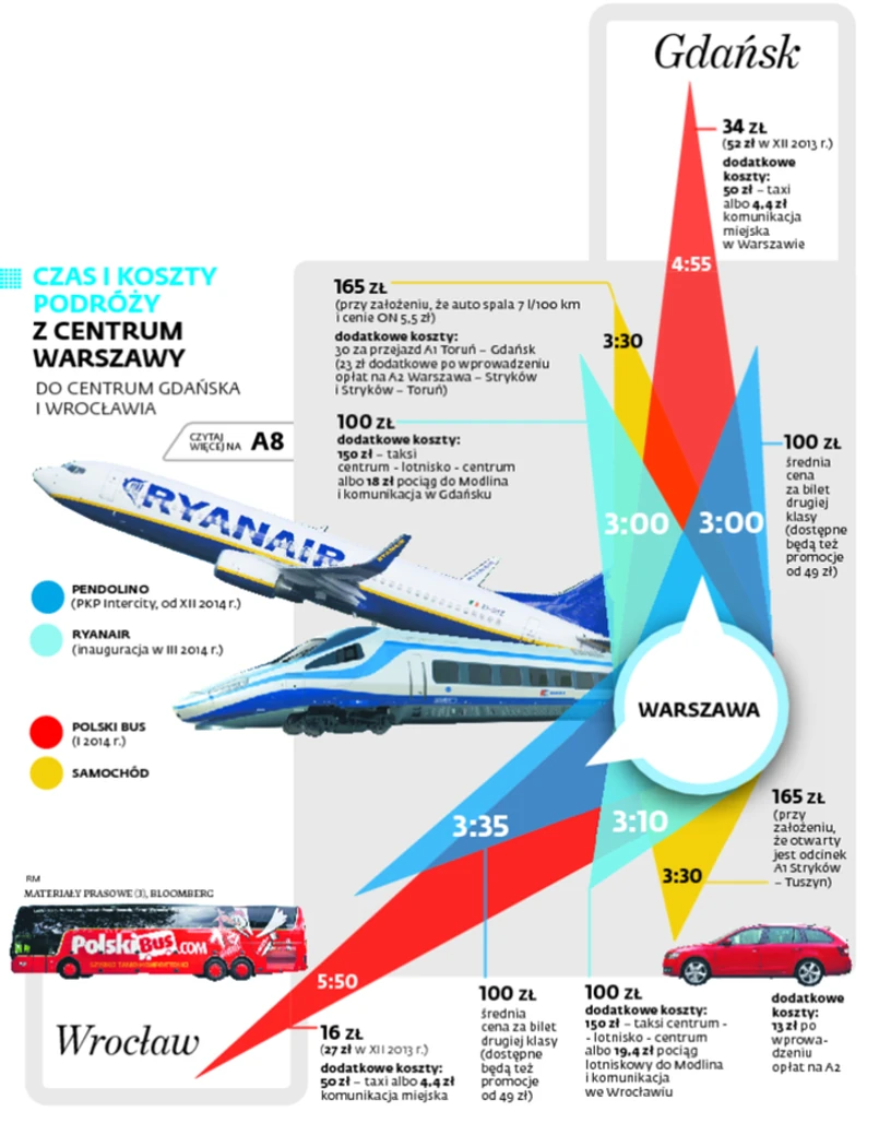 Na trasie z Warszawy do Trójmiasta walkę o pasażerów ma szanse wygrać pendolino, a w przypadku połączenia między stolicą a Wrocławiem – Ryanair. Ale cenowo nie do pobicia jest Polski Bus.