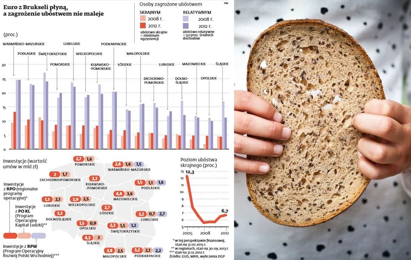 Od 2008 r., gdy ruszyły konkursy na uzyskanie wsparcia w tej perspektywie finansowej, do końca ubiegłego roku poziom zagrożenia skrajnym ubóstwem zmniejszył się jedynie w trzech województwach: dolnośląskim, śląskim i świętokrzyskim. W zachodniopomorskim się nie zmienił. W pozostałych 12 regionach wzrósł. Najbardziej, o 3,8 pkt proc. w warmińsko-mazurskim – do 13,2 proc.