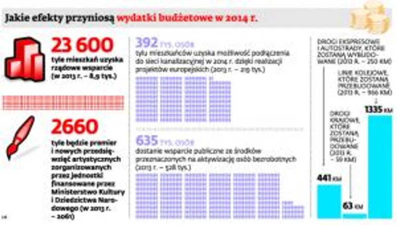 Z kolei, co niektórych podatników nie ucieszy, urzędnicy skarbówki mają odzyskać więcej pieniędzy należnych Skarbowi Państwa. Z budżetu zadaniowego wynika, że w wyniku kontroli skarbowych publiczną kasę ma zasilić kwota o ok. 50 mln zł większa niż w roku obecnym (w 2013 r. – 2,25 mld zł, w 2014 r. – 2,3 mld zł). Ma również powstać nieco więcej obiektów sportowych i zostać zgłoszonych więcej patentów międzynarodowych (o 100 więcej niż w 2013 r.).