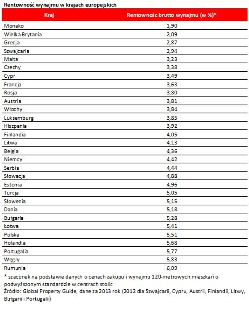 Po drugiej stronie tabeli znajdują się przeważnie kraje, w których ceny nieruchomości znacząco spadły w trakcie kryzysu. W efekcie można dziś kupić tam mieszkanie na wynajem za znacznie mniejsze pieniądze niż przed kryzysem, a wynająć je można za niewiele niższą lub nawet wyższą stawkę niż jeszcze kilka lat temu. Przykładem może być Rumunia, która jest wg danych GPG, krajem o najwyższej w Europie zyskowności wynajmu. Kraj ten, po czteroletniej przecenie mieszkań i pomimo polepszających się wskaźników gospodarczych, wciąż ma słaby rynek nieruchomości. W drugim kwartale br. ceny mieszkań były prawie o 6 proc. niższe niż w analogicznym okresie przed rokiem. Dzięki korekcie cen możliwe są do osiągnięcia wyższe rentowności wynajmu. W przypadku 120-metrowych apartamentów w centrum Bukaresztu rentowność brutto jest szacowana na 6,1 proc. w skali roku. O ponad 1 pkt. proc. wyższe zyskowności są możliwe do osiągnięcia w przypadku bardziej popularnych lokali 50-metrowych.