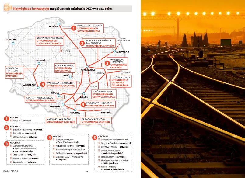 Dzisiaj roboty torowe nadzorowane przez PKP Polskie Linie Kolejowe toczą się w 250 miejscach i obejmują ponad 3,2 tys. km torów. W tym roku PKP PLK wydadzą na modernizacje i remonty infrastruktury 5,5 mld zł. To wynik sześciokrotnie wyższy od 2005 r., ale i tak poniżej obietnic z początku roku, kiedy była mowa o 7 mld zł. – Zaplanowane na 2014 r. 9 mld zł brzmi nieprawdopodobnie, ale większość inwestycji jest już zakontraktowana. Zapadła decyzja na najwyższym szczeblu, żeby rozpoczynać budowy nawet kosztem terapii szokowej dla pasażerów – usłyszeliśmy w PKP PLK.
