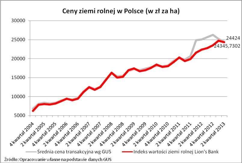 Od końca 2004 roku (od kiedy dostępność danych pozwalała na stworzenie indeksu) ceny ziemi wzrosły o 292 proc., czyli średnio 17,4 proc. w skali roku. Dane pochodzące z Eurostatu, które mają dłuższą historię, pokazują, że ziemia rolna drożeje znacznie dłużej. Urząd szacuje bowiem, że w 1990 roku, za hektar gruntu rolnego w Polsce trzeba było zapłacić równowartość 224 euro. Fakt, że wspomniany trend trwa wiele lat może generować zagrożenie korektą. Z drugiej strony, wciąż aktualne są argumenty przeciwników realizacji takiego scenariusza, którzy zwracają uwagę na: