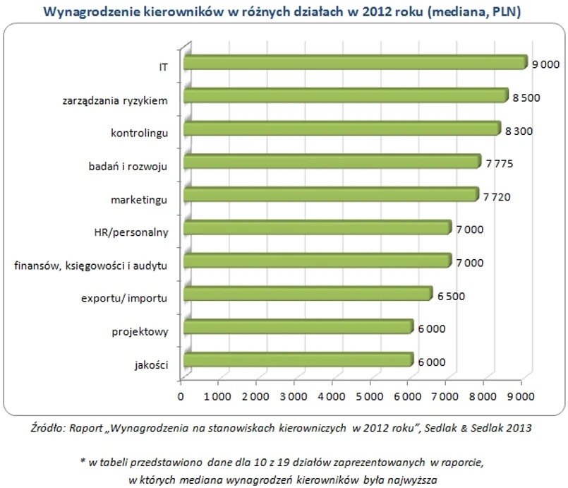 Rozpiętość zarobków kierowników wahała się w zależności od działu. I tak na najlepsze warunki finansowe mogli liczyć kierownicy działów IT (9000 zł), zarządzania ryzykiem (8500 zł) oraz kontrolingu (8300 zł). Z kolei najmniej zarobili kierownicy działów jakości, projektowego (6000 zł) oraz działu importu/eksportu (6500 zł).