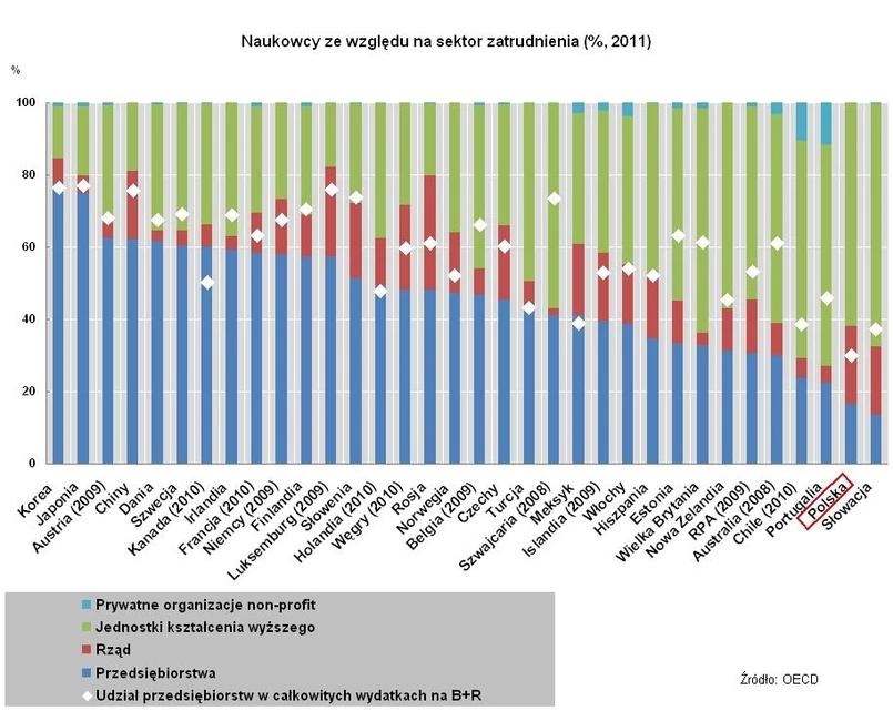 Jak wynika z raportu OECD, w jednostkach komercyjnych pracuje niezwykle mała część wszystkich naukowców - w 2011 roku było to zaledwie 16,5 proc.