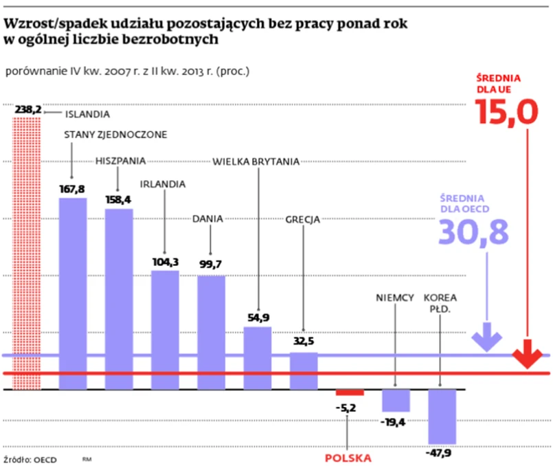 Choć to marna pociecha, statystycznie mamy nieco lepszą sytuację w porównaniu z innymi państwami członkowskimi OECD. W tym samym czasie bowiem w Hiszpanii liczba osób pozostających bez zajęcia przez ponad rok zwiększyła się aż siedmiokrotnie, w Irlandii – czteroipółkrotnie, a w Wielkiej Brytanii – prawie półtorakrotnie. W tym czasie na Węgrzech odsetek ten skoczył o 46,1 proc., Słowacji – o 31,4 proc., a w Czechach – o 29,8 proc. W Unii Europejskiej najbardziej znacząca poprawa sytuacji nastąpiła w Niemczech. Choć i RFN przeżywała różne turbulencje gospodarcze, włącznie z recesją, liczba bezrobotnych długoterminowych zmniejszyła się w latach 2007–2013 o ponad 19,4 proc., wszystkich bezrobotnych zaś – o jedną trzecią.