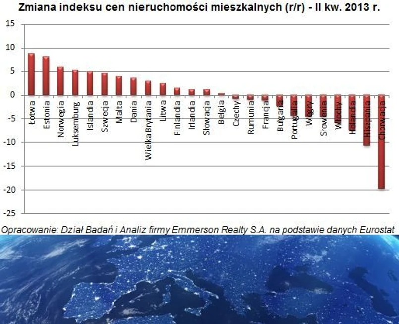 Zagregowane wyniki dla całej Unii Europejskiej wskazują, iż w II kw. 2013 r. indeks cen nieruchomości mieszkalnych okazał się niższy o 1,3 proc. w porównaniu do analogicznego okresu roku ubiegłego. Sytuacja w poszczególnych krajach, dla których danymi dysponował Eurostat, oczywiście znacząco się od siebie różni.