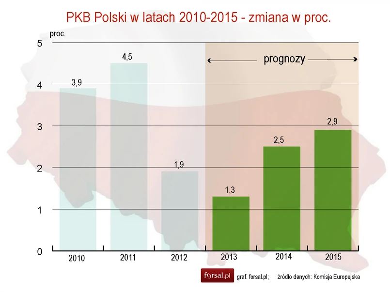 W Polsce za głównego winowajcę niemrawego wzrostu w pierwszym i drugim kwartale roku podawany jest słaby popyt wewnętrzny. W całym 2013 r. PKB ma rosnąć wolniej niż rok wcześniej – o 1,3 proc. – a większe odbicie jest również prognozowane na 2014 i 2015 rok, kiedy to gospodarka ma rosnąć odpowiednio o 2,5 i 2,9 proc.
