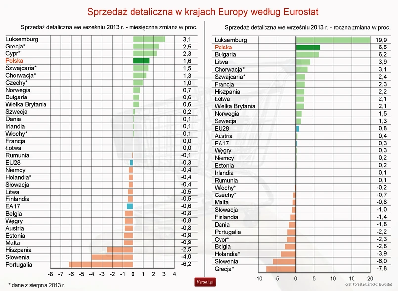 Jak podał unijny urząd statystyczny Eurostat, sprzedaż detaliczna wyrównana sezonowo w Polsce odnotowała we wrześniu br. w ujęciu rocznym wzrost o 6,5 proc. W poprzednim miesiącu wzrost wyniósł 4,5 proc. r/r.