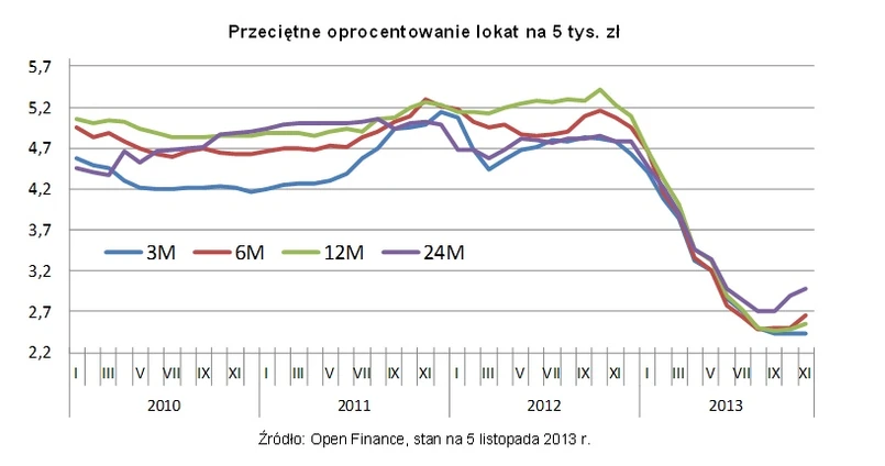 Przeciętne oprocentowanie średnio- i długoterminowych depozytów zaczyna powoli rosnąć. Wprawdzie średnia stawka dla lokat kwartalnych spadła o 0,01 pkt proc. m/m do 2,43 proc., ale już depozyty półroczne dają zarobić 2,65 proc., tj. o 0,14 pkt proc. więcej niż miesiąc wcześniej. Przeciętne oprocentowanie lokat 12- i 24-miesięcznych wzrosło o 0,08 pkt proc. m/m, odpowiednio do 2,56 proc. oraz 2,98 proc. Wśród zmian, które banki wprowadzają do tabel oprocentowania depozytów wciąż przeważają obniżki, jednak ich skala jest już na tyle niewielka, że o wzroście średnich stawek decydują promocje wprowadzane przez pojedyncze instytucje. Niewykluczone, że w obawie o dalszy odpływ oszczędności z lokat (21,2 mld zł w siedem miesięcy) banki coraz częściej będą zachęcać klientów promocyjnymi ofertami, które wymagają wpłaty nowych środków.
