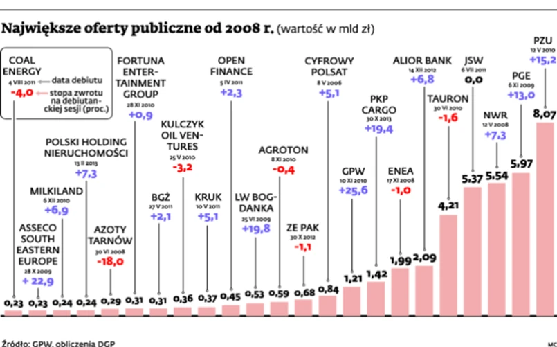 Inwestorzy indywidualni zastanawiają się z kolei, czy debiut Energi może być tak udany jak w przypadku PKP Cargo. Akcje przewoźnika poszybowały w pierwszym dniu notowań o ponad 20 proc. PKP Cargo był jednak pierwszą spółką ze swojej branży na naszej giełdzie (na świecie firmy kolejowe są notowane głównie w Ameryce). W przypadku oferty spółki energetycznej trudno mówić o wyjątkowości. Firm z branży wytwarzania energii na polskiej i na giełdach w całej Europie jest sporo. U nas notowane są m.in. PGE, Tauron i Enea. Z debiutami tych firm było różnie. Tauron i Enea w pierwszych dniach notowań nie przyniosły nadzwyczajnych zysków. Kurs PGE na otwarciu pierwszej sesji w listopadzie 2009 r. wzrósł zaś o 13 proc.