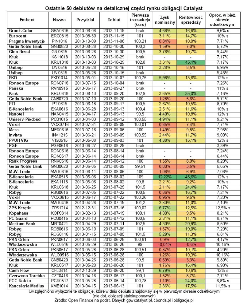 Dwa poprzednie listopadowe debiuty dały zarobić zauważalnie mniej. Inwestorzy, którzy nabyli na rynku pierwotnym obligacje firmy pożyczkowej Eurocent i sprzedali je po 101 proc. podczas pierwszej sesji w 77 dni zarobili 3,11 proc. (2,11 proc. na odsetkach i 1 proc. na sprzedaży powyżej nominału). W 30 dni 0,84 proc. dały zarobić natomiast papiery dłużne Pragmy Inwestycje. Średni nominalny zysk z 50 ostatnich debiutów na detalicznej części Catalyst wynosi 2,87 proc., zaś przeciętny czas od przydziału papierów do zawarcia pierwszej transakcji na rynku wtórnym (nie zawsze jest to pierwsza sesja) wynosi 79 dni.