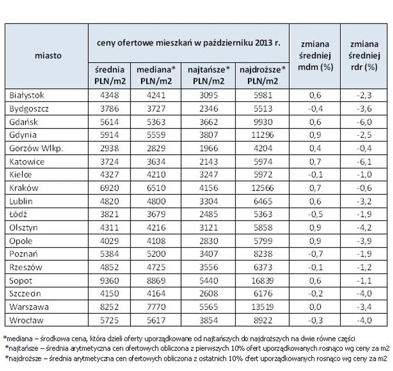 Na największym w kraju – warszawskim rynku wtórnym sprzedaży mieszkań – średnia cena ofertowa w październiku pozostała taka sama jak we wrześniu i wyniosła 8252 zł/m2. W porównaniu z październikiem ub. roku ceny mieszkań używanych w stolicy spadły o 3,4%.