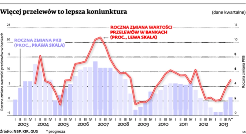 Analizując dane historyczne, można zauważyć, że wzrostowi dynamiki produktu krajowego brutto towarzyszy zazwyczaj wzrost wartości przelewów w systemie Elixir. Przykładem mogą być lata 2005–2007, gdy gospodarka przyspieszała z kwartału na kwartał. Wraz z nią coraz szybciej rosła wartość transakcji płatniczych. Gdy później koniunktura się pogorszyła, wzrost wartości przelewów także zwolnił. Przyspieszył ponownie w 2010 r., gdy gospodarka wychodziła z dołka. Z kolei w pierwszej połowie 2013 r., gdy kwartalny wzrost PKB wynosił 0,5–0,8 proc., dynamika wartości transakcji również była bliska zeru. Teraz przyspiesza, co może być kolejnym elementem potwierdzającym, że nasza gospodarka najgorsze ma już za sobą.