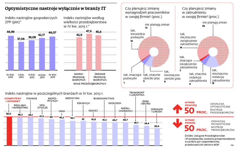 Ogólna atmosfera w firmach z sektora MSP nadal jest zła. Ale gdy przyjrzeć się poszczególnym branżom, to widać spore dysproporcje między nimi. Najgorsze nastroje są w branżach kosmetycznej, biurowej oraz w transporcie i logistyce – pesymizm w tych działach gospodarki sięgnął 30–40 pkt. Najlepiej jest zaś w branżach komputerowej i internetowej – tu można już mówić o początkach optymizmu, bo wskaźnik wynosi tu 50,5 pkt. Całkiem przyzwoicie jest też w finansach, reklamie i marketingu, gdzie wskaźnik wynosi 49,1–49,3 pkt.