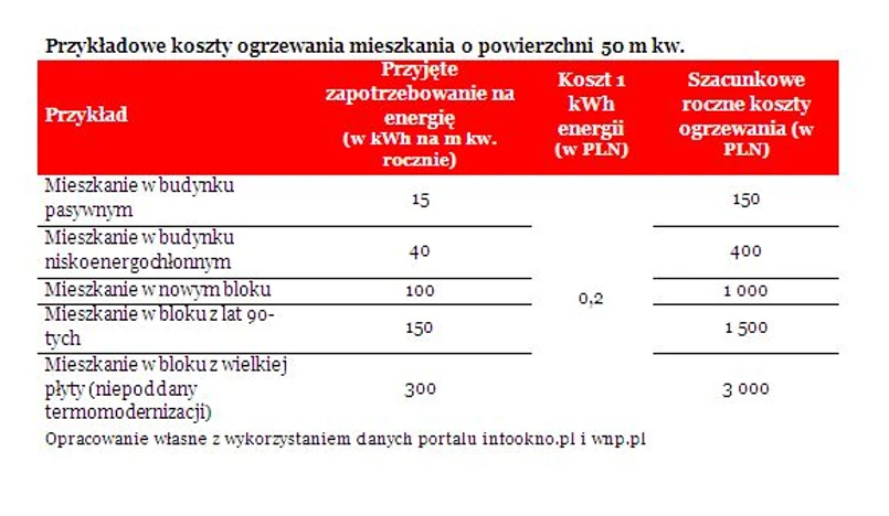 Teoretycznie bowiem im bardziej energooszczędna nieruchomość, tym niższe koszty utrzymania, a więc więcej pieniędzy powinno zostać w kieszeni właściciela. O jakich kwotach mówimy? Rozważmy przykład przeciętnego 50-metrowego mieszkania w bloku z „wielkiej płyty”. Gdyby był on zbudowany przed 85 rokiem i nie poddano by go do tej pory gruntownej termomodernizacji, to jego zapotrzebowanie na energię cieplną mogłoby wynieść nawet 300 kWh energii na m kw. rocznie. Biorąc pod uwagę, że dziś średni koszt kWh energii cieplnej można szacować na 0,2 zł, to roczny rachunek za ciepło w modelowym mieszkaniu wyniósłby 3000 zł. Poprawnie przeprowadzona termomodernizacja może ten koszt zmniejszyć nawet o ponad połowę. W efekcie zakup na wynajem mieszkania o lepszej charakterystyce energetycznej można zaoszczędzić około 1000 – 2000 zł rocznie na ogrzewaniu – o tyle większa kwota zostałaby w kieszeni inwestora, który kupiłby na wynajem modelowe mieszkanie o dobrej charakterystyce energetycznej.