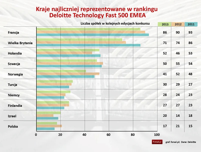 W tym roku w zestawieniu EMEA znalazło się 17 spółek z Polski. Dla porównania, jeszcze trzy lata temu Polska miała zaledwie sześciu swoich reprezentantów w tym rankingu. Jeżeli jednak spojrzymy na zeszłoroczną edycję zestawienia, powodów do optymizmu jest mniej, bowiem w 2012 roku do grona wyróżnionych firm załapało się 21 przedsiębiorstw z naszego kraju.