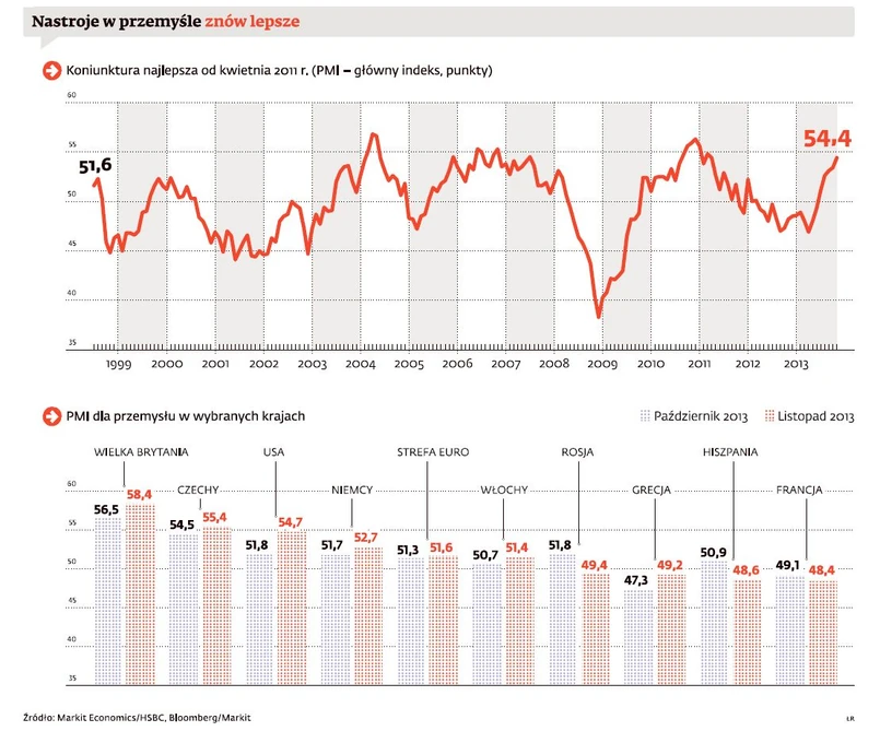 Informacje o PMI wpisują się w ogólnoeuropejski trend: w największych gospodarkach Starego Kontynentu stopniowo postępuje ożywienie. Jeden z wyjątków to Francja, gdzie nastroje przedsiębiorców wyraźnie się pogorszyły. Ale już w Niemczech, czyli u głównego odbiorcy polskiego eksportu, PMI wzrósł o punkt i wyniósł w listopadzie 52,7 pkt. A w Wielkiej Brytanii (jeden z głównych kierunków polskiej emigracji ostatnich lat) wynik jest jeszcze lepszy: indeks wyniósł 58,4 pkt, o prawie 2 pkt więcej niż miesiąc wcześniej.
