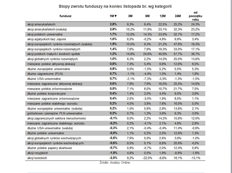 W listopadzie dynamika wzrostu kursów akcji nieco wyhamowała, zmniejszyło się więc także tempo, w jakim przyrastała w ostatnich miesiącach wartość jednostek uczestnictwa funduszy inwestycyjnych, zwłaszcza akcji. Niemniej, po raz kolejny większość (64 proc.) z ponad 400 monitorowanych przez nas funduszy skończyło miesiąc na plusie.