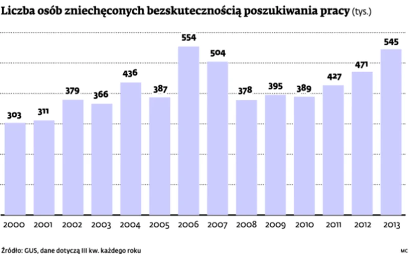 Takie wnioski płyną z badań aktywności ekonomicznej ludności prowadzonych przez GUS. Tymczasem od sierpnia do października stopa rejestrowanego bezrobocia ani drgnęła i wyniosła 13 proc. Najczęściej poddają się osoby powyżej 50. roku życia, zwłaszcza jeśli dobrze zarabiały.