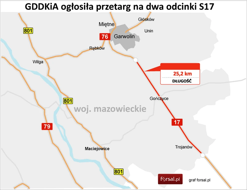 "Przetarg obejmuje zaprojektowanie i wybudowanie drogi ekspresowej S17 wraz z uzyskaniem decyzji zezwolenia na realizację inwestycji drogowej i składa się z dwóch części. Pierwsza dotyczy odcinka o długości 12,227 km od końca obwodnicy Garwolina do końca obwodnicy Gończyc, a druga od końca obwodnicy Gończyc do granicy województw o długości 13,012 km" - czytamy w komunikacie.