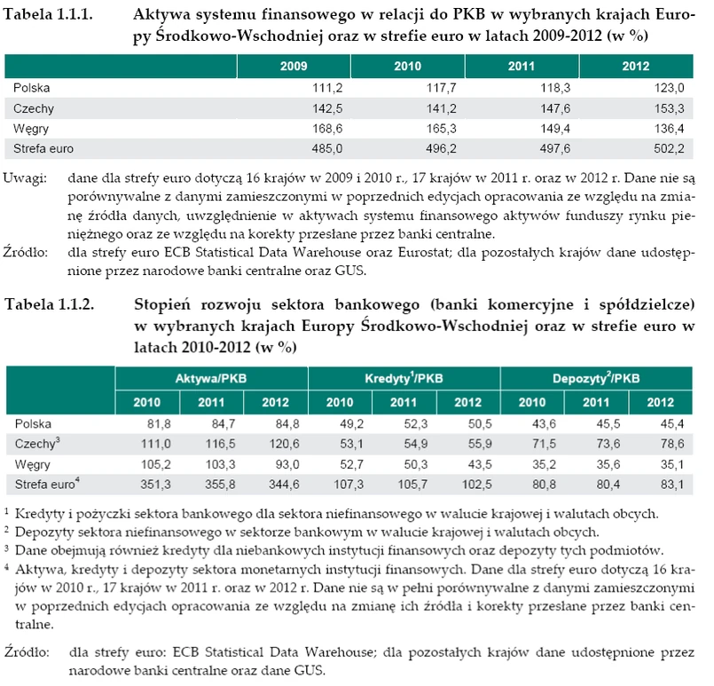 Banki odpowiadały w Polsce w 2012 roku za 69,8 proc. wartości aktywów systemu finansowego, a w przypadku Węgier, Czech i Słowacji było to odpowiednio 81,5 proc., 79,4 proc. i 73,5 proc. Wynika to z relatywnie wysokiego udziału funduszy emerytalnych, których aktywa stanowiły 13,7 proc. całego sektora finansowego.