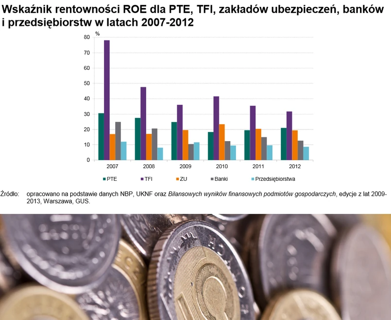 Z raportu wynika, że w 2012 r. towarzystwa funduszy inwestycyjnych miały średnio ponad 30-proc. stopę zwrotu z kapitału, w przypadku PTE było to ponad 20 proc., w ubezpieczeniach blisko tego poziomu, a banki zanotowały kilkunastoprocentową stopę zwrotu. Dla porównania – w firmach było to poniżej 10 proc.