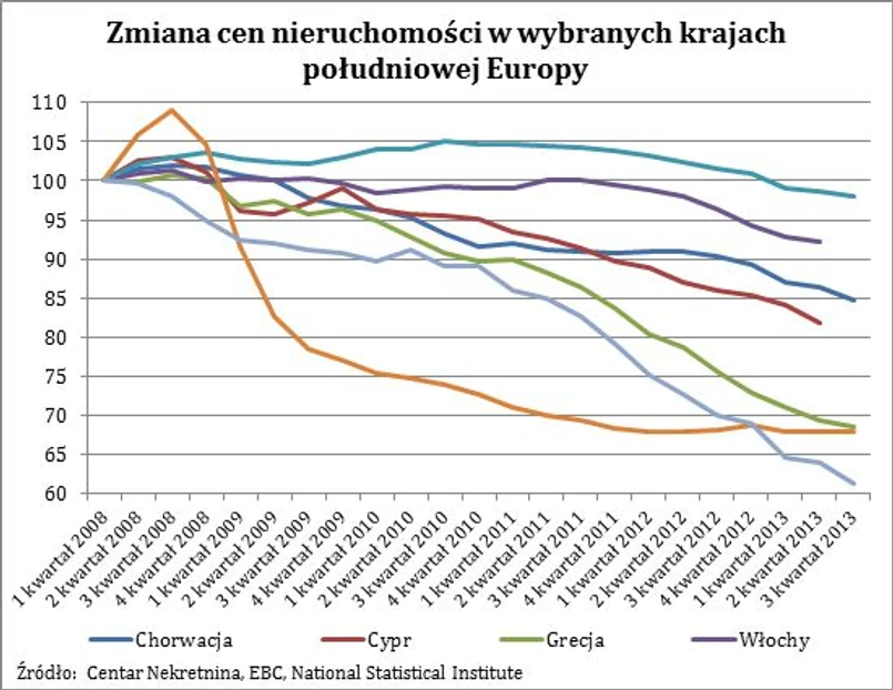 Do grona krajów, w których obniżki cen zaczęły się relatywnie niedawno (1-2 lata temu) zaliczyć można Włochy i Portugalię. Nie powinno więc dziwić, że w krajach tych skala obserwowanej przeceny nie jest jeszcze nawet dwucyfrowa. Krajem, w którym przecena przerodziła się w ostatnim czasie w stabilizację cen jest Bułgaria - w ostatnich 12 miesiącach zmiana cen wyniosła tam -0,4 proc.