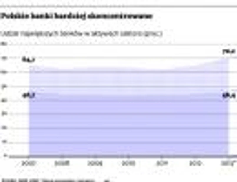 Jak wynika z danych Komisji Nadzoru Finansowego, już w połowie bieżącego roku udział 10 największych banków w aktywach sektora minimalnie przekroczył 70 proc. To najwyższy poziom od 2004 r. Fala fuzji na początku ubiegłej dekady doprowadziła do tego, że pod kontrolą czołowej dziesiątki znalazło się niemal 78 proc. aktywów sektora, później jednak następował systematyczny spadek tego udziału. Znaczenie pierwszej dziesiątki z powrotem zaczęło rosnąć dopiero w takt nowej fali przejęć i połączeń, jakie miały miejsce w ostatnich trzech latach.