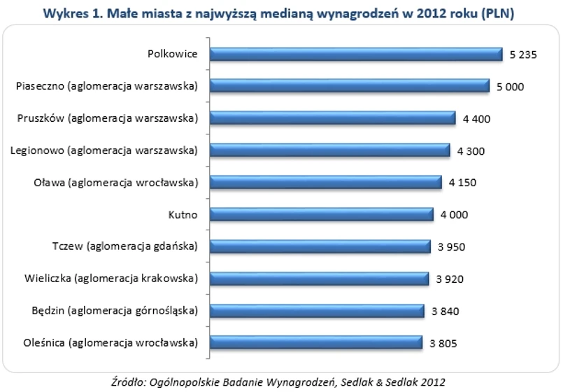 Wśród mniejszych miast najwyższe przeciętne wynagrodzenia odnotowano w 2012 roku w Polkowicach. W tym dolnośląskim mieście mediana zarobków wyniosła 5 235 zł brutto miesięcznie. Na drugim i trzecim miejscu rankingu znalazły się miasta wchodzące w skład aglomeracji warszawskiej – Piaseczno i Pruszków. Przeciętne wynagrodzenie wyniosło tam odpowiednio 5 000 zł i 4 400 zł.