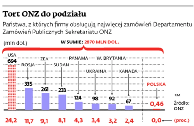 Ponad jedna czwarta zeszłorocznego budżetu zakupowego ONZ przypada na transport powietrzny. Ale duże kwoty organizacja wydaje również np. na żywność i catering, a także usługi budowlane czy telekomunikacyjne. – Polskie firmy nie wiedzą o tych możliwościach oraz jak się w tym systemie zamówień publicznych poruszać. Dlatego ich udział w ogóle zleceń dotychczas był mały – tłumaczy wiceminister spraw zagranicznych Katarzyna Kasperczyk. Ale wkrótce powinno się to zmienić. MSZ wspólnie z przedstawicielami ONZ organizuje seminarium, które ma pokazać polskim przedsiębiorcom, jak składać swoje oferty w internetowym systemie zamówień organizacji. Udział w odbywającym się dziś spotkaniu zapowiedziało ponad 50 firm.