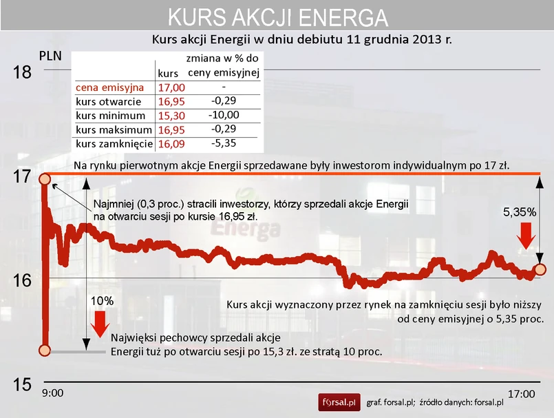 Dzisiejsza sesja na warszawskiej giełdzie nie była korzystna dla debiutującej Energi. Kurs gdańskiej spółki był na otwarciu o 0,3 proc. niższy od ceny emisyjnej i wyniósł 16,95 zł, by po chwili spaść o 10 proc. do poziomu 15,4 zł. Finalnie kurs na zamknięciu był o 5,35 proc. niższy od ceny emisyjnej i wyniósł 16,09 zł.