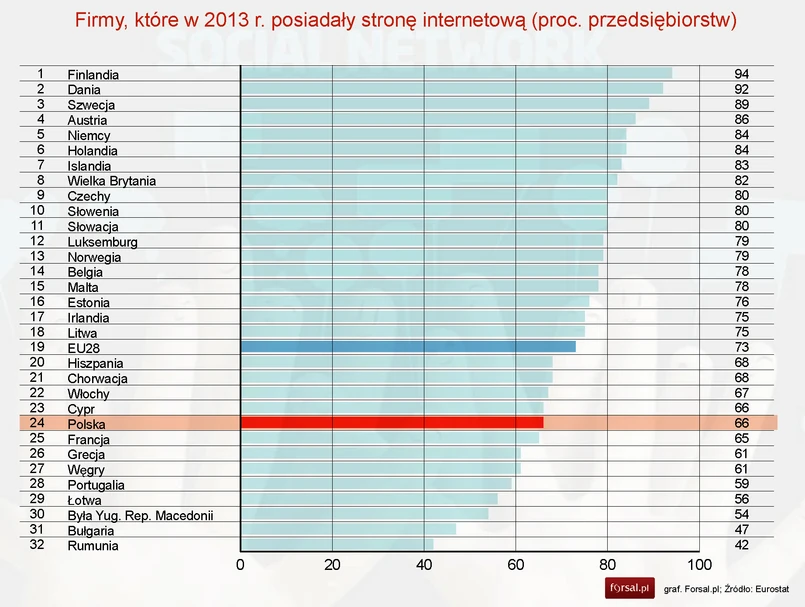 W czołówce zestawienia firm, które posiadają swoją stronę internetową, znalazły się firmy z Finlandii (94 proc.), Danii (92 proc.), Szwecji (89 proc.), Austrii (86 proc.), a także Niemiec i Holandii (84 proc.).