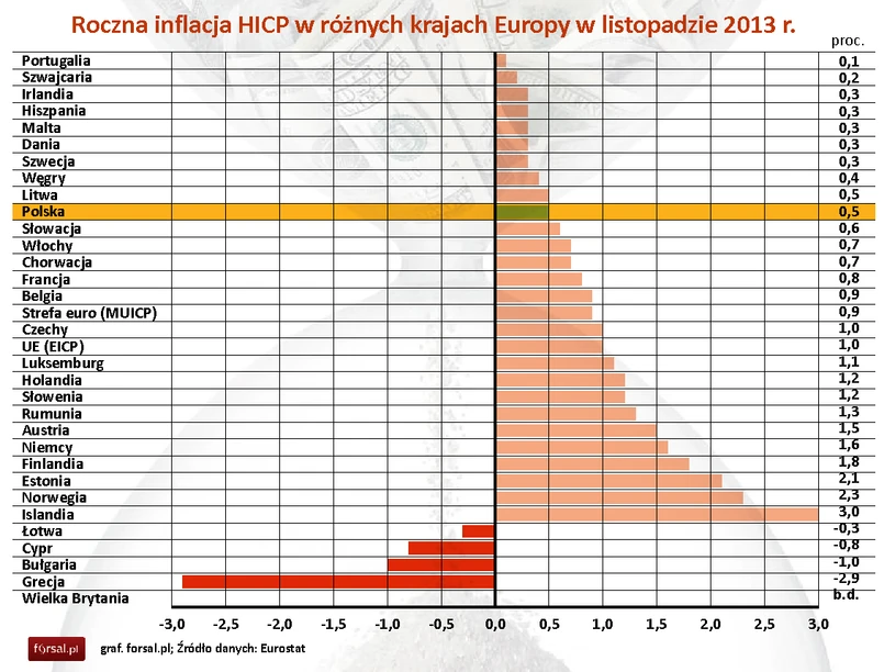 Najniższy wskaźnik w ujęciu rocznym odnotowano w Grecji (-2,9 proc.), Bułgarii (-1,0 proc.) i na Cyprze (-0,8 proc.) , a najwyższy w Estonii (2,1 proc.) , Finlandii (1,8 proc.) i Niemczech (1,6 proc.) . W porównaniu z październikiem 2013 r. spadek inflacji zaobserwowano w 11 państwach członkowskich, wzrost w 13, a w trzech pozostała na niezmienionym poziomie. W ujęciu miesięcznym tempo wzrostu wskaźnika cen było najniższe w Grecji (-0,7 proc.), Łotwie (0,2 proc.) oraz Szwecji (0,5 proc.) , natomiast najwyższe w Rumunii (3,5 proc.), Estonii (3,4proc.) , Chorwacji i Holandii (w obu krajach 2,7 proc.).