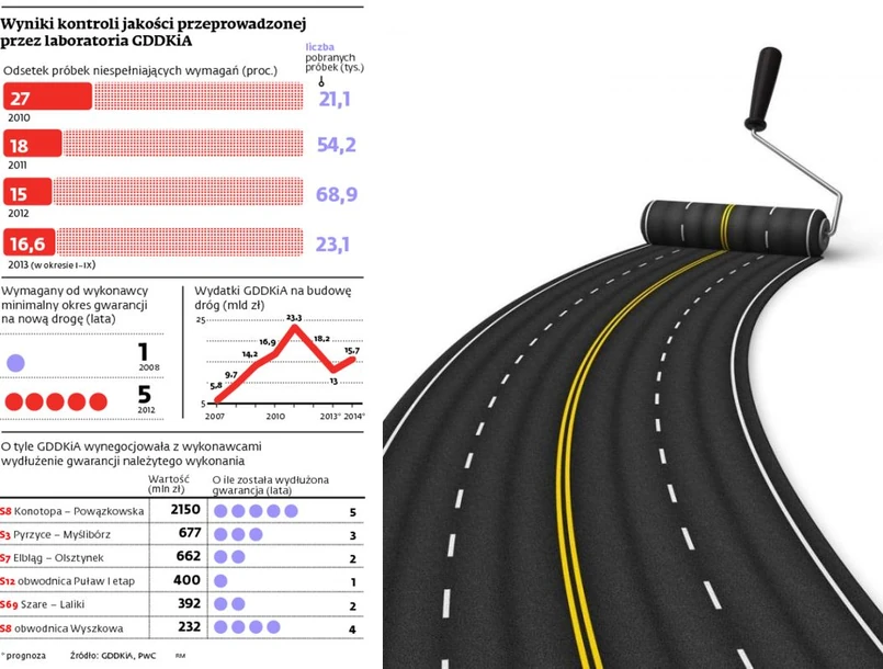 Od 2010 do 2012 r. liczba pobranych próbek wzrosła ponadtrzykrotnie. Jednocześnie nastąpił spadek odsetka negatywnych wyników, które oznaczają niezgodny z wymogami dobór materiałów i w przyszłości mogą doprowadzić np. do szybszego pękania nawierzchni. W tym roku do października laboratoria pobrały 23 tys. próbek, z których ponad 83 proc. pozytywnie przeszło test.