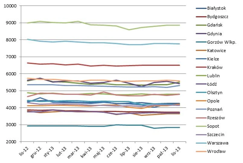 Praktycznie cały 2013 rok, a już jego druga połowa w szczególności, to czas wyraźnej stabilizacji cen ofertowych mieszkań na rynku wtórnym. W porównaniu z listopadem 2013 roku stawki w największych miastach spadły średnio o 2,5 proc.; najbardziej w Katowicach – o 5,5 proc. i Olsztynie – o 5,2 proc., a najmniej w Rzeszowie i Sopocie – poniżej 1 proc.