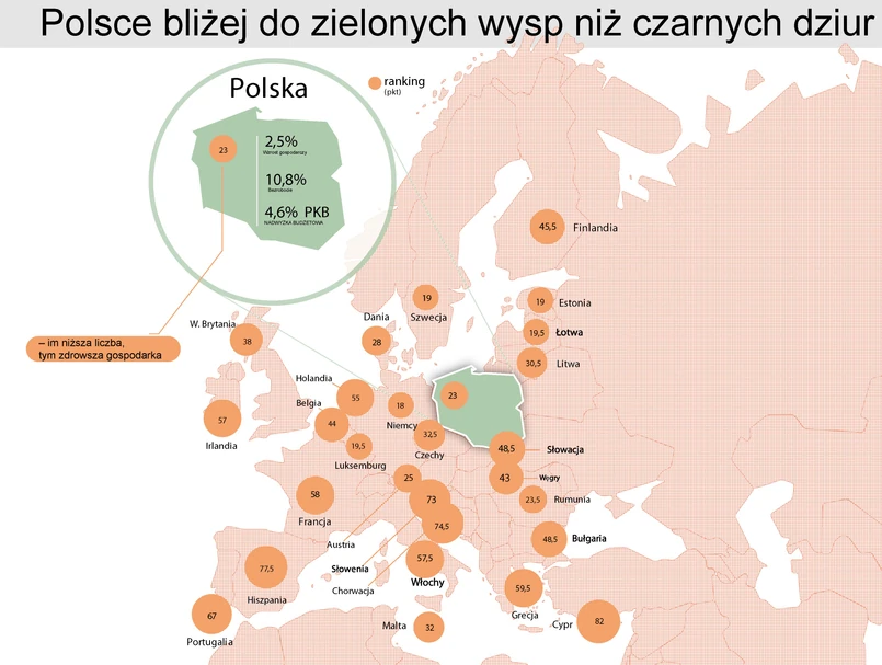 Zwycięzcą rankingu okazały się Niemcy, które maja wprawdzie przeciętny wzrost gospodarczy, ale niskie bezrobocie i niewielka nadwyżkę budżetową (18 punktów), minimalnie wyprzedzając Estonię i Szwecję (po 19). Polska z wynikiem 23 punktów zajęła wysokie, szóste miejsce, czyli znajduje się w grupie unijnych liderów. Niestety ten stan nie do końca odpowiada rzeczywistości.