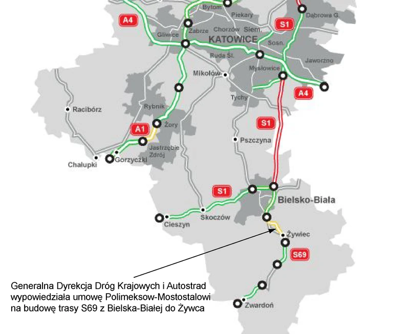 "W ramach dokończenia budowy S69 Bielsko-Biała Żywiec- Zwardoń, odcinek węzeł 'Mikuszowice' ('Żywiecka/Bystrzańska') – Żywiec, wykonawca wyłoniony w postępowaniu przetargowym będzie miał za zadanie wykonanie wszystkich niedokończonych robót przez poprzedniego wykonawcę" - czytamy w komunikacie.