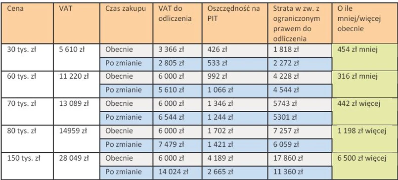 Kupując zatem auto o wartości 30 tys. zł przedsiębiorca odliczy 3 366 zł. Nieodliczona część (2 244 zł) zostanie zaliczona do kosztów uzyskania przychodu, co w efekcie zmniejszy podatek dochodowy o 426 zł. Gdy wejdą w życie projektowane regulacje, to kwota odliczenia spadnie do 2 895 zł. Drugą połowę przedsiębiorca zaliczy do kosztów, zmniejszając w ten sposób zobowiązanie wobec fiskusa o 533 zł. Przedsiębiorca, który kupuje zatem tańsze auto osobowe i nie będzie w stanie wykazać, że używane jest wyłącznie na potrzeby działalności gospodarczej, straci na tych zmianach tylko w zakresie kupowanego samochodu 454 zł.