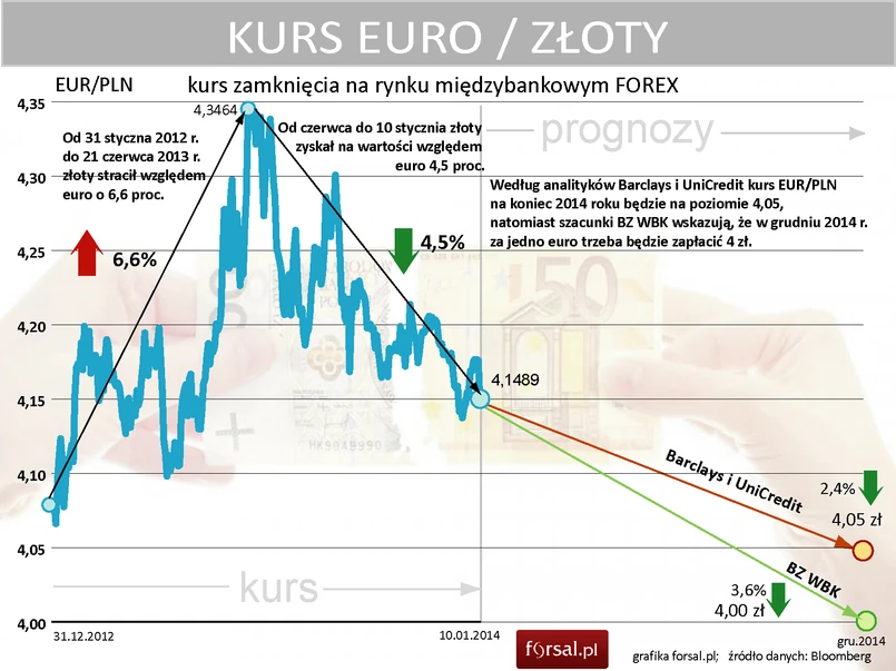 Drugie miejsce w rankingu najtrafniejszych prognoz walutowych Bloomberga zajął Bank Zachodni WBK, który w ubiegłym roku został przejęty przez hiszpańskiego Santandera. Analitycy BZ WBK przewidują, że na koniec 2014 roku jedno euro będzie kosztować 4 zł.