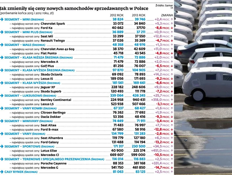 Z dokładnej analizy zestawienia Samaru wynika, że najbardziej, bo o ponad 25 proc., podrożały w ubiegłym roku samochody luksusowe i sportowe. W tych segmentach rosły nie tylko ceny Bentleya czy Ferrari, ale też o blisko 7 proc. Audi A7 i A8. W tej kategorii najlepiej wypadł Mercedes. Modele CLS i S podrożały bowiem tylko o około 1 proc. Tego typu samochody stanowią jednak niespełna 1 proc. polskiego rynku, a o wskaźniku wzrostu często mogą decydować pojedyncze zamówienia na droższe wersje pojazdów.