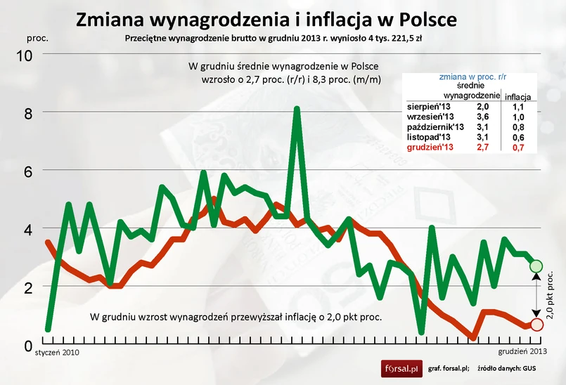 Przeciętne wynagrodzenie w sektorze przedsiębiorstw w grudniu 2013 r. wzrosło o 2,7 proc., zaś zatrudnienie w przedsiębiorstwach zwiększyło się o 0,3 proc. względem grudnia 2012 roku, podał Główny Urząd Statystyczny.