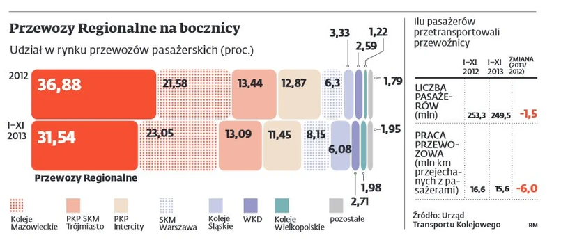 Bije alarmowy dzwonek dla Przewozów Regionalnych, czyli wydzielonej z PKP spółki, której współwłaściciele to 16 samorządów wojewódzkich. Jak wynika z danych Urzędu Transportu Kolejowego, Koleje Mazowieckie, Śląskie, Wielkopolskie i Dolnośląskie oraz prywatna Arriva mają łącznie prawie 33 proc. rynku. Przewozy Regionalne po raz pierwszy w historii mniej – o 1 pkt proc. (reszta rynku należy do PKP Intercity oraz przewoźników miejskich). Przewozy wciąż są liderem rynku, ale ich pozycja topnieje. W 2012 r. miały jeszcze 9 pkt proc. przewagi nad głównymi konkurentami.
