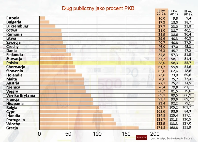 Najwyższe zadłużenie odnotowano w Grecji (171,8 proc.), we Włoszech (132,9 proc.), Portugalii (128,7 proc.) oraz Irlandii (124,8 proc.). Natomiast najniższy stosunek długu do PKB mają Estonia (10 proc.), Bułgaria (17,3 proc.) i Luksemburg (27,7 proc.).