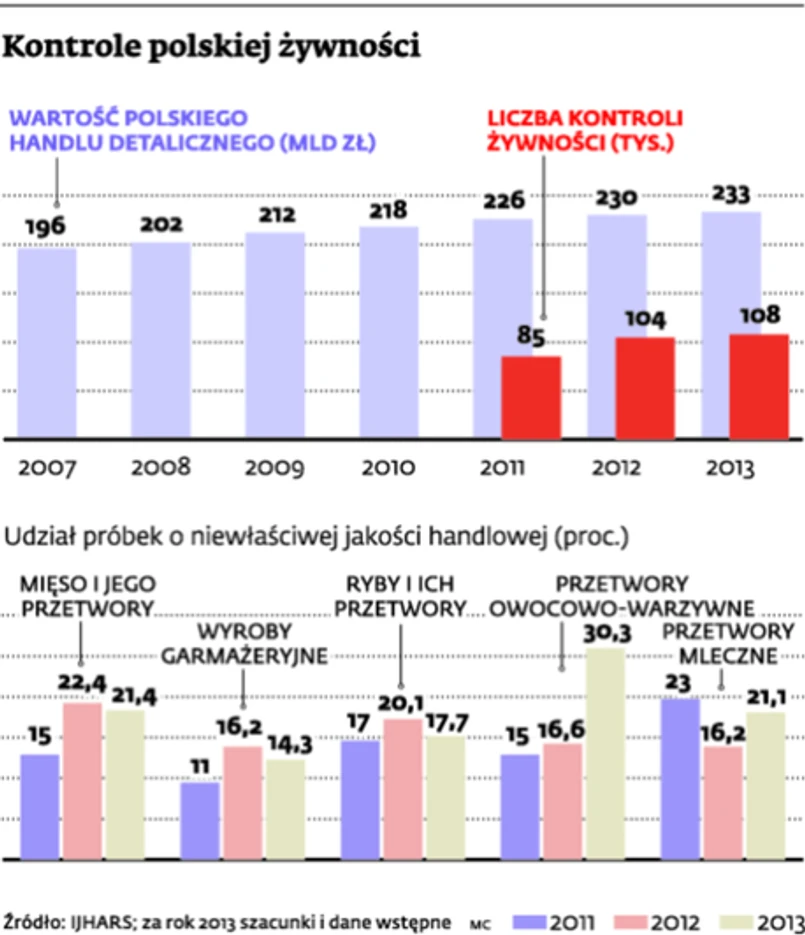 Jak wynika z danych Inspekcji Jakości Handlowej Artykułów Rolno-Spożywczych, najwięcej nieprawidłowości ujawnianych jest w branżach: mięsnej, rybnej, mleczarskiej, piekarniczej i cukierniczej. – Z fałszerzami walczy też branża alkoholowa. Wartość szarej strefy ocenia się na 18 mln litrów 100-proc. alkoholu, czyli na 15 proc. rynku mocnych alkoholi. Rocznie z tego powodu budżet traci 1,2 mld zł, a branża – 345 mln zł – wyjaśnia Leszek Wiwała, prezes Związku Pracodawców Polskiego Przemysłu Spirytusowego. W tym roku, jak dodaje, na skutek podwyżki akcyzy może wzrosnąć nawet dwukrotnie.