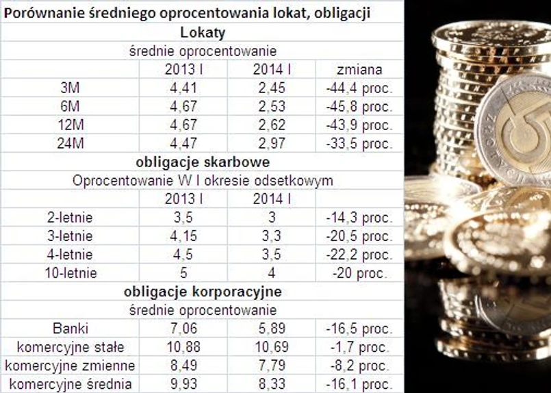 Cykl naszych porównań oprocentowania lokat, obligacji skarbowych i korporacyjnych ma blsiko dwa lata, co pozwala na dokonanie pewnych obserwacji i wysuwania ostrożnych wniosków. Choć stopy WIBOR są stabilne od ośmiu miesięcy przewaga oprocentowania obligacji nad lokatami skurczyła się nieznacznie w ostatnim kwartale (w październiku 2013 r. wynosiła 230 proc., obecnie 215 proc.). Ta tendencja powinna się utrzymać w najbliższych miesiącach, bowiem rynek obligacji korporacyjnych musi coraz mocniej konkurować z rynkiem bankowym. W bankach natomiast widać wyraźne sygnały otwarcia na kredyty dla firm, zaś koszty kredytów są obecnie znacznie niższe niż koszty związane z emisją i obsługą obligacji. Zatem konkurencja z kredytami bankowymi może wymusić dalszy spadek marż na rynku obligacji, zaś wprowadzanie niżej oprocentowanych papierów na Catalyst i jednoczesne wycofywanie starszych serii, które bądź zapadają, bądź są wykupywane przed terminem przez samych emitentów, zaowocować może dalszym spadkiem średniego oprocentowania.